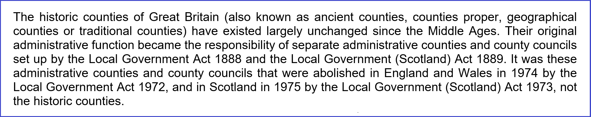 Consequently, the pattern of administrative counties and county boroughs which existed immediately prior to 1974 was already radically different in many places to that of the historic counties.